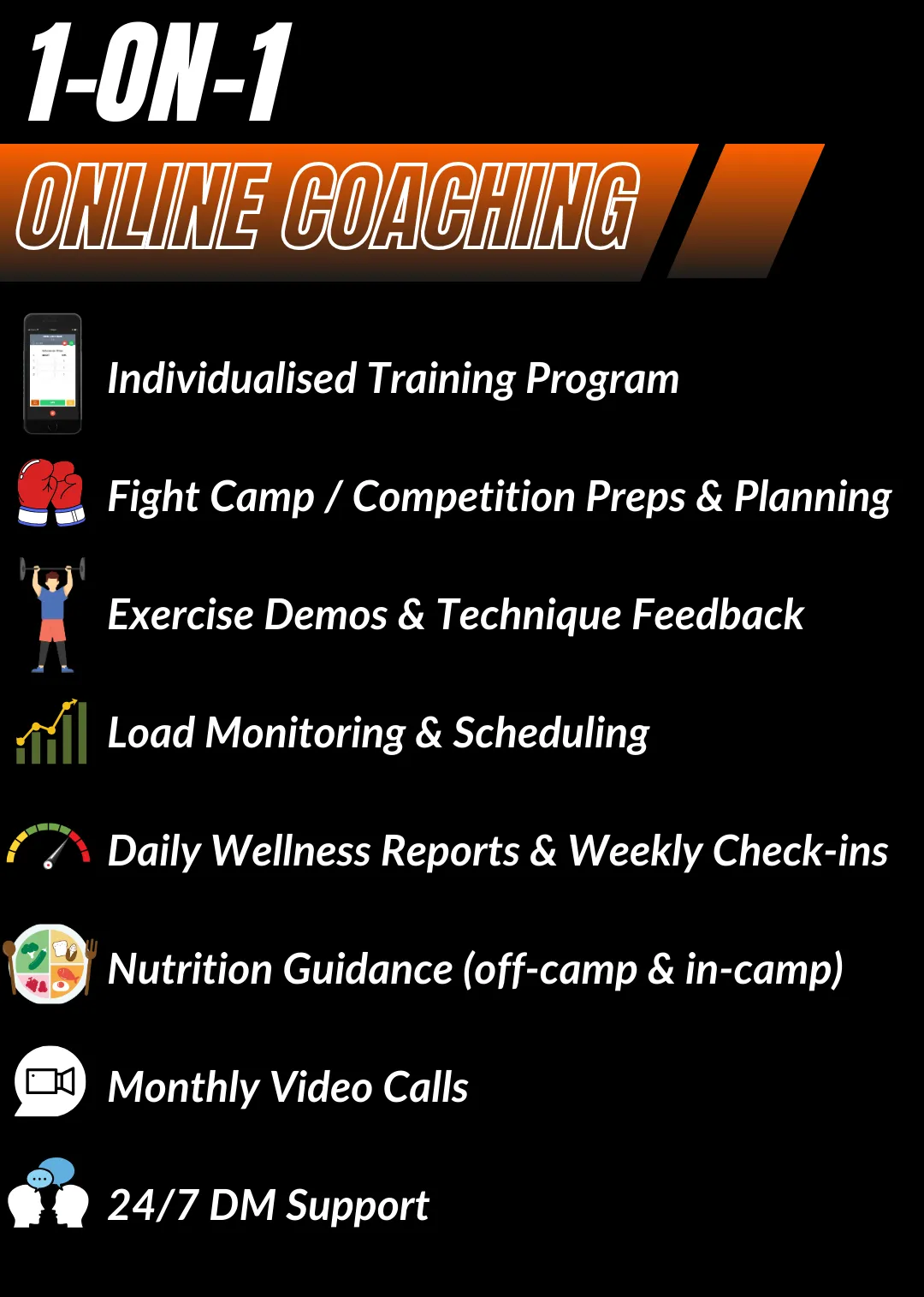 Coaching that never clocks out. Send videos, ask questions, and get feedback anytime. Whether it’s technique fixes, nutrition guidance, recovery tweaks, or fight-week adjustments, you always have elite support in your corner - so you never train with uncertainty or get stuck.